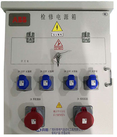 檢修電源箱是一種集合三相插座,單項(xiàng)插座,直流插座,相應(yīng)的保護(hù)裝置,其允許電流較大,裝置在廠房周?chē)?,便于檢修時(shí)插接各種電動(dòng)工具,電氣設(shè)備,照明燈等的臨時(shí)用電裝置。檢修電源箱是為了檢修方便而設(shè)計(jì)的,對(duì)保護(hù)電源有極大的用處,具有過(guò)載、短路保護(hù)、漏電保護(hù)功能。